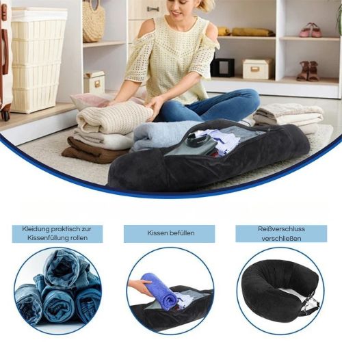 Mach deine Reise entspannter: Cosy Flight ist Nackenkissen und Stauraum in einem – bequem schlafen & alles Wichtige griffbereit.